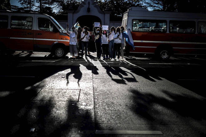 Um grupo de mães fazem manifestação em frente a uma escola em apoio à volta das aulas, nesta segunda-feira (19), em Buenos Aires, na Argentina, onde as aulas continuam sendo presenciais depois que um tribunal decidiu contra a decisão do governo argentino de cancelá-las por duas semanas