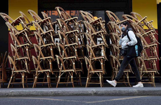 Uma pedestre usando máscara protetora passa pelo terraço de um café com cadeiras empilhadas do lado de fora de um restaurante, em Paris, capital da França