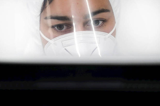 Um profissional de saúde testa para covid-19 alunos e docentes no regresso das aulas presenciais da Faculdade de Direito da Universidade de Lisboa, em Portugal, no âmbito das novas medidas de desconfinamento relacionadas à pandemia do coronavírus