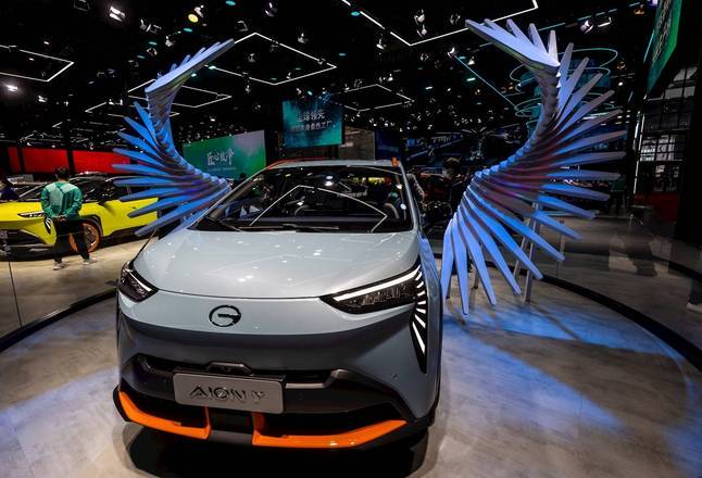 Um GAZ Motor AIONY está em exibição no estande da GAZ Motor no Salão do Automóvel de Xangai, evento realizado na China
