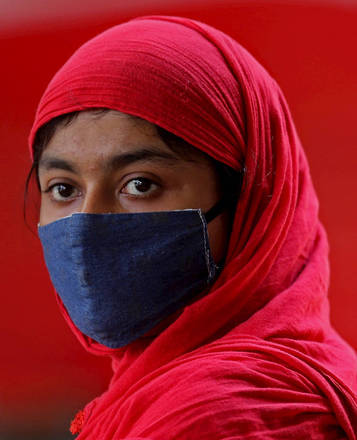 Mulher indiana usa uma máscara facial protetora em Bangalore, na Índia, em meio ao maior pico de infecções por covid-19 em um único dia no país na pandemia
