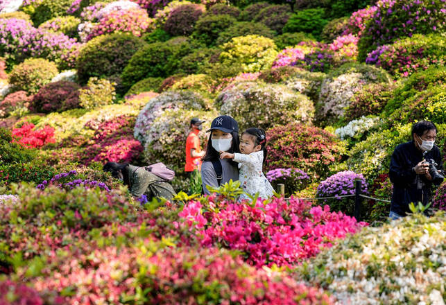 Pessoas observam de flores de azaleia no jardim do Santuário Nezu localizado em Tóquio, no Japão