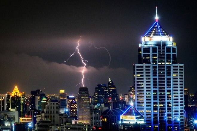 Um raio atinge um edifício durante uma tempestade em Bangkok, capital da Tailândia