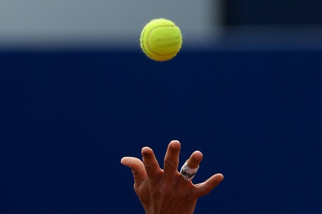 Rafael Nadal, da Espanha, realiza um saque contra o japonês Kei Nishikori durante o Barcelona Open, torneio da ATP