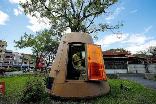 Uma mulher lê um livro dentro da réplica de uma cápsula espacial feita de materiais domésticos reciclados do lado de fora de uma livraria em Yilan, leste de Taiwan