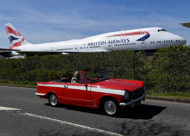 Um carro clássico é visto ao lado de um Boeing 747 da British Airways desativado, estacionado no Aeroporto de Cotswold, na Inglaterra