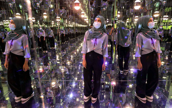 Um visitante posa em uma instalação de ilusão de ótica no Illusion Museum, localizado em Arbil, no Iraque