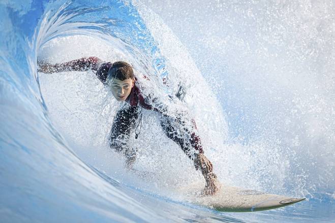 O surfista suíço Antoine Habashi pega uma onda artificial na piscina de "Alaia Bay" em Sion, na Suíça