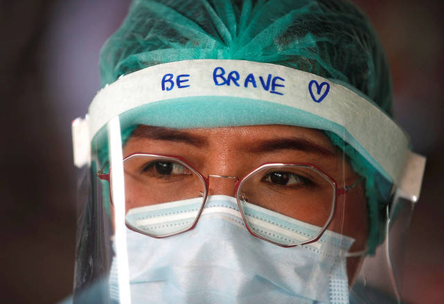 Uma enfermeira tailandesa usa um protetor facial escrito "seja corajoso" durante um teste de covid-19 para residentes pobres na favela de Klong Toey, em Bangkok, na Tailândia