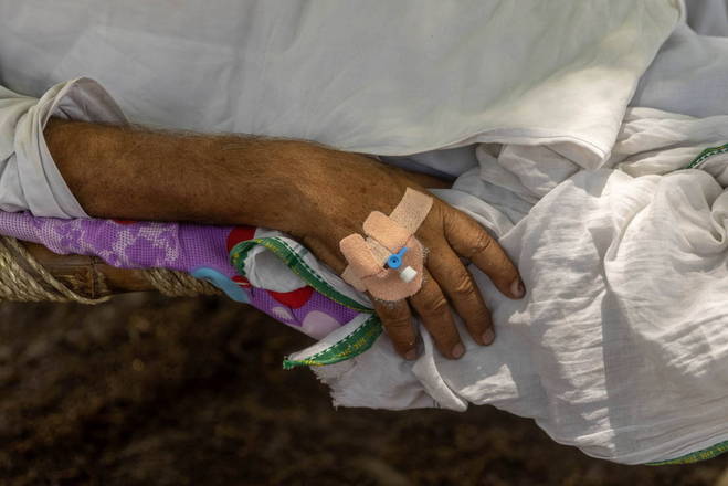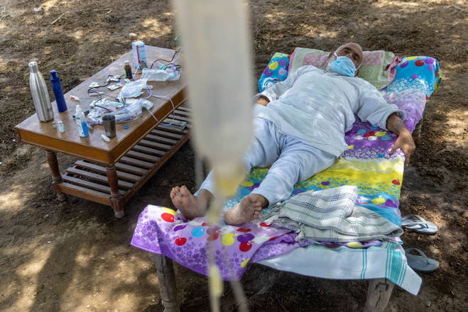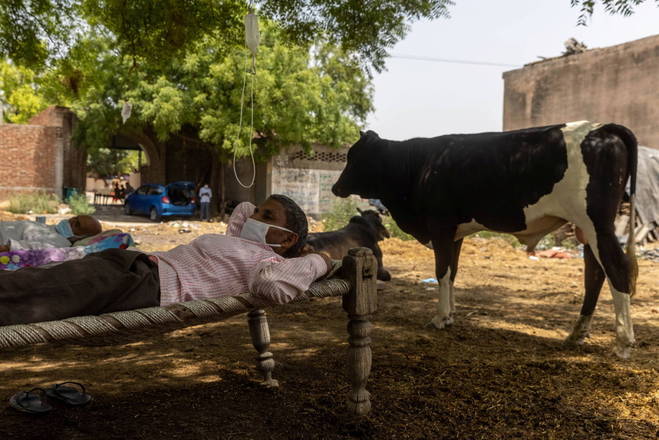 Em um vilarejo do norte da Índia assolado pela covid-19, os doentes jazem em catres sob uma árvore com bolsas de soro intravenoso penduradas em galhos. Vacas pastam ao redor, e seringas e embalagens de produtos médicos vazias ficam espalhadas pelo chão
