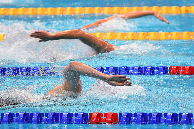 Tamryn Van Selm, do Reino Unido, compete em uma bateria para o evento feminino de 4x200m durante o Campeonato Europeu de Esportes Aquáticos na Duna Arena em Budapeste, capital da Hungria