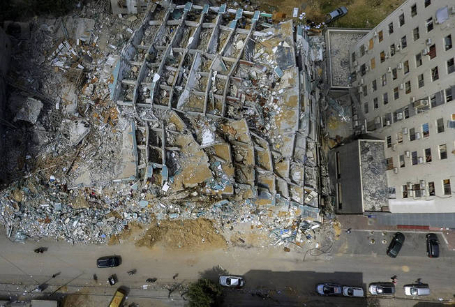 Vista aérea mostra a Torre Al-Jalaa na Cidade de Gaza, que foi destruída por um ataque aéreo israelense durante o recente conflito militar entre Israel e o grupo terrorista