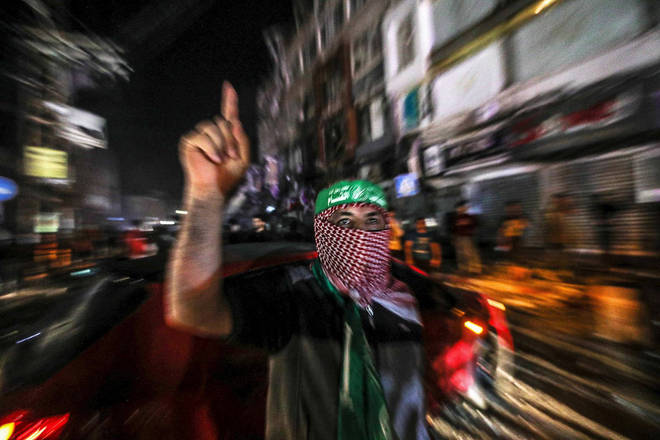 Palestinos comemoram após um cessar-fogo entre israelenses e o grupo extremistas Hamas na Faixa de Gaza. Os conflitos duraram 11 dias