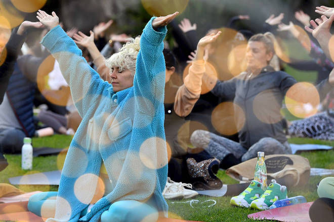Convidados participam de uma aula de meditação em massa em comemoração ao Dia Mundial da Meditação, no Royal Botani em Sydney, na Austrália
