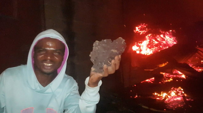 Em outros registros, um morador posa com um pedaço de lava resfriado