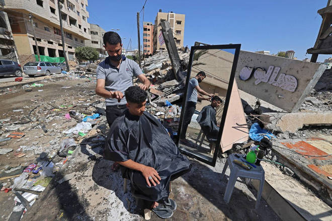 Um barbeiro palestino trabalha próximo às ruínas de prédios e lojas destruídas pelos ataques durante os conflitos das últimas semanas entre o grupo Hamas e militares israelenses