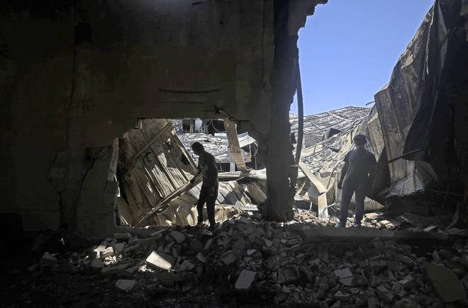Trabalhadores palestinos resgatam itens de uma fábrica danificada na área industrial de Gaza que foi atingida por bombardeios israelenses nas últimas semanas