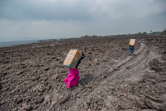Moradores carregam mercadorias nas costas enquanto cruzam um campo coberto de lava em Buhene, ao norte de Goma, na República Democrática do Congo. O vulcão Nyiragongo entrou em erupção no país nosábado (22)