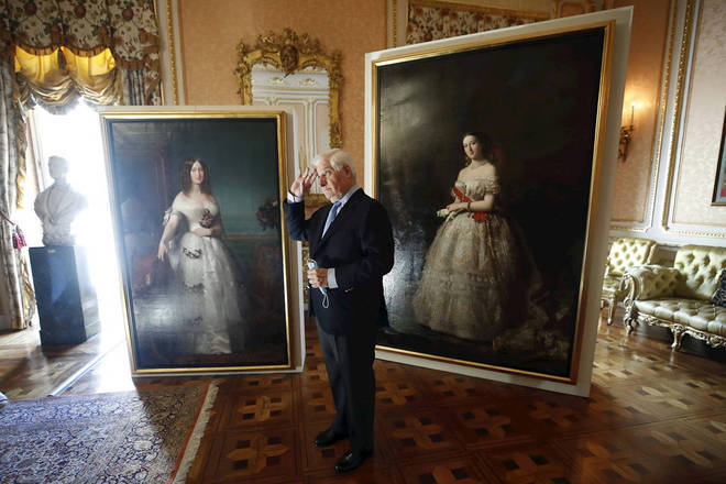 Carlos Fitz-James Stuart y Martínez de Irujo, duque de Alba, posa com várias das pinturas que integram a exposição temporária "Eugenia Emperatriz" no Palácio de Liria, em Madrid, na Espanha de 24 de maio a 30 de dezembro