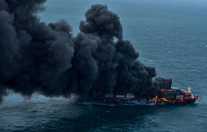 Imagem mostra o incêndio em um navio que está no porto de Colombo, localizado no Sri Lanka