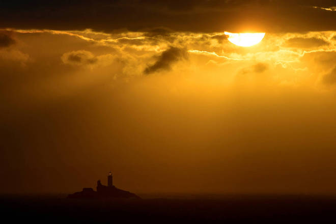 O farol de Godrevy, localizado no condado de Cornualha, no Reino Unido, é visto logo após o nascer do Sol