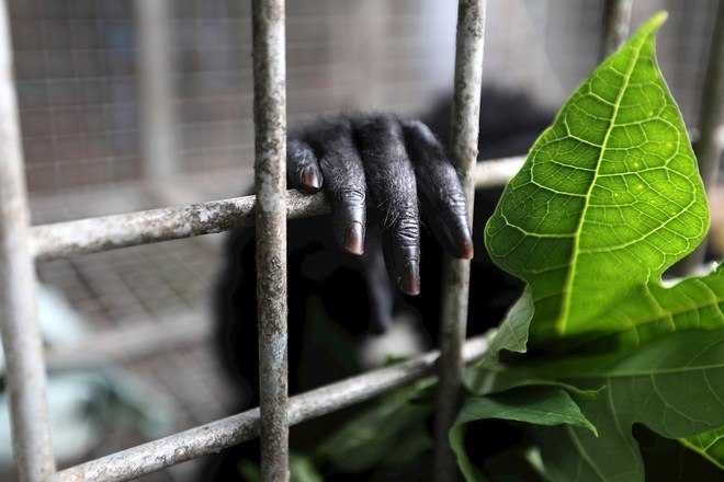 A mão de um siamang (Symphalangus syndactylus) no Centro de Reabilitação para Animais Ameaçados, administrado pela Aceh Nature Conservation Agency em Banda Aceh, Indonésia. O animal foi entregue por um morador da região que o manteve em casa como animal de estimação e será devolvido ao seu habitat natural em alguns meses