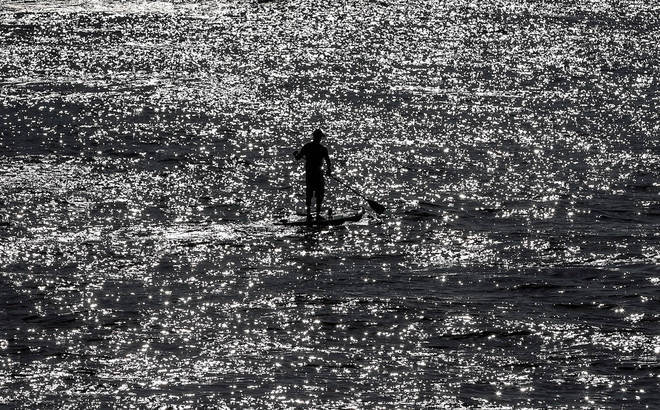 Um homem pratica paddle surna praia de Ondarreta em San Sebastián, onde o céu amanheceu nublado