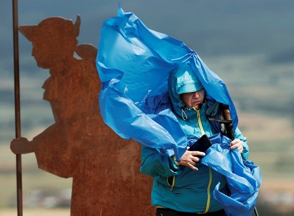 Um peregrino no topo da Serra del Perdón, na província de Navarra, na Espanha, luta contra o vento forte para tentar tirar uma foto