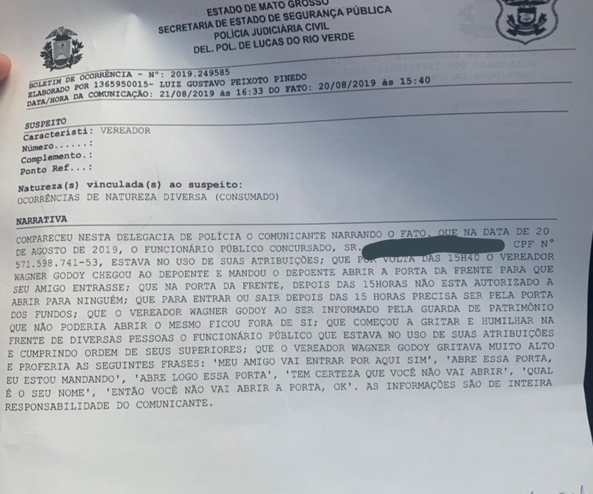 Conforme boletim de ocorrência, o vereador Wagner Godoy esteve na prefeitura na tarde de terça, quando ao tentar entrar pela porta da frente, o qual já tinha terminado o horário de atendimento ao público, foi informado para entrar por outro local. Irritado, o legislador passou a destratar e gritar com o servidor da guarda patrimonial.