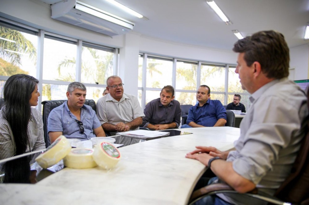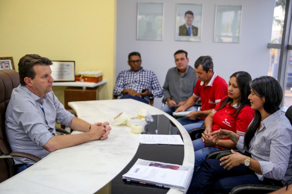 O prefeito de Sorriso, Ari Lafin, recebeu nesta quarta-feira (4), a visita de pequenos produtores do Assentamento Jonas Pinheiro (Poranga). Acompanhados pelos secretários de Agricultura e Meio Ambiente, Márcio Kuhn, de Governo, Marlon Zanella, e o vereador Dirceu Zanatta, os produtores de leite trouxeram amostras de queijos produzidos no assentamento, todos com Selo de Inspeção Municipal (SIM).