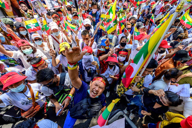 Migrantes de Mianmar na Tailândia gritam palavras de ordem em protesto contra o golpe militar em seu país, em frente ao prédio da ESCAP das Nações Unidas, em Bangcoc
