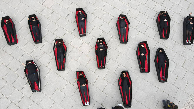 Foto área mostra mulheres simulando estar em caixões como forma de protesto contra a violência doméstica, em Tel Aviv, Israel, na véspera do Dia Internacional da Mulher