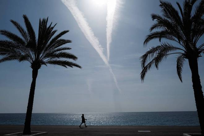 Pedestre caminha no famoso Promenade des Anglai durante o segundo fim de semana de lockdown para conter a transmissão da covid-19 em Nice, na Riviera Francesa