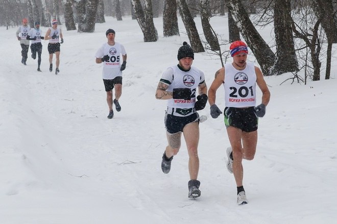 Na Rússia, atletas fazem uma prova de criatlo de inverno, que inclui corrida na neve, corrida de esqui e natação no gelo. A prova deste domingo acontece na região de Moscou