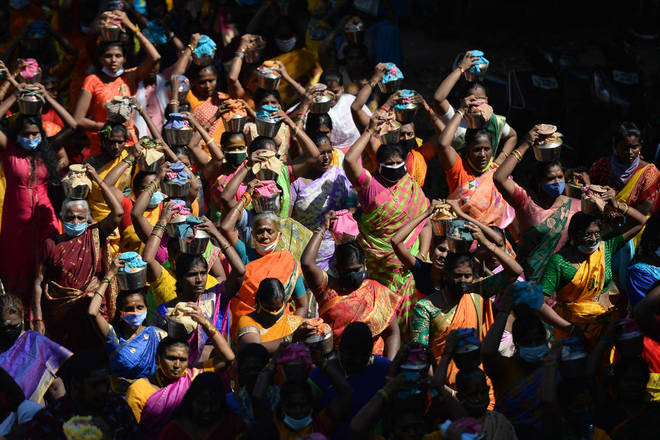 Devotos hindus carregam potes de leite enquanto participam de uma procissão para marcar o festival hindu Maha Shivratri, em Chennai, Índia
