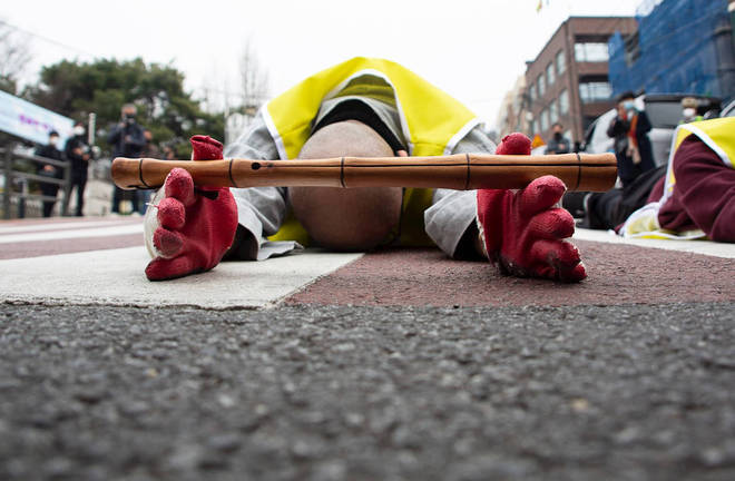 Em frente à embaixada de Mianmar em Seul, Coreia do Sul, cidadãos birmaneses protestam contra o golpe militar que acontece no seu país