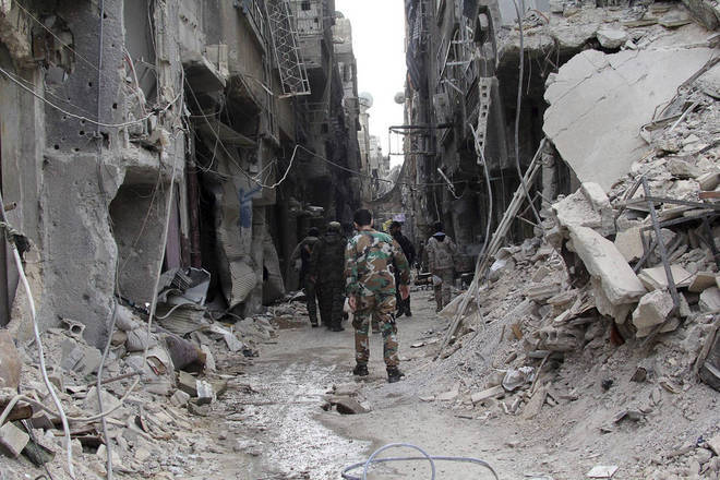 Foto tirada em 2015 mostra combatentes palestinos fazendo segurança em um campo de refugiados no sul de Damasco. Há 10 anos iniciavam-se os protestos contra o governo de Bashar al Assad na Síria