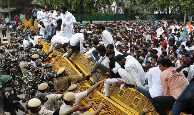 Polícia indiana detém membros da União Nacional de Estudantes da Índia enquanto eles escalam as barricadas policiais durante um protesto contra o aumento do desemprego em Nova Delhi, na Índia