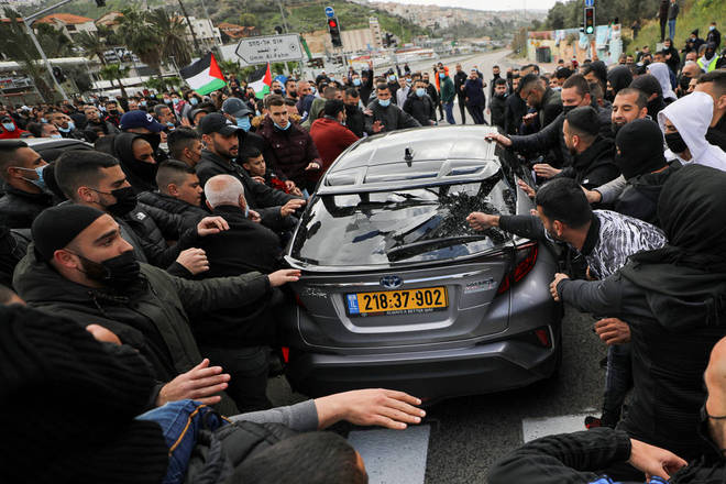 Manifestantes quebra a janela de um carro que passava durante um protesto contra uma onda de violência policial em comunidades na cidade de Umm el Fahm, no norte de Israel