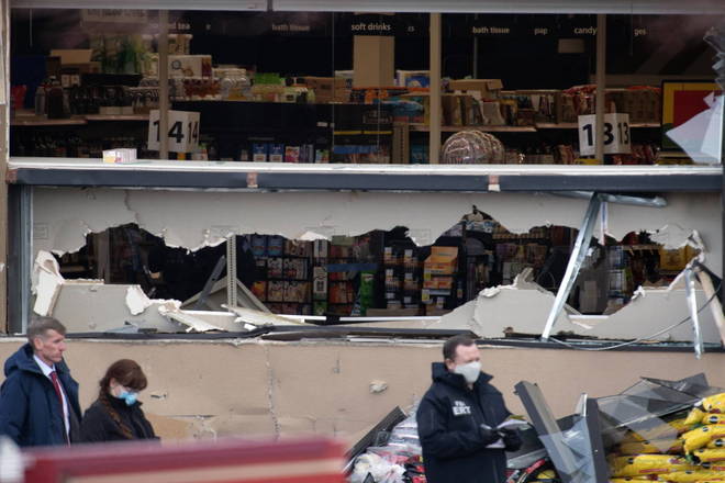 Uma das mulheres que trabalha no local foi consolada após conseguir escapar ilesa do ataque. Clientes e funcionários ficaram do lado de fora do mercado enquanto a polícia prendia o atirador