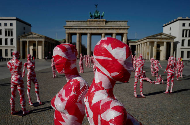 Manequins enrolados em fita isolante ficam em frente ao famoso Portão de Brandemburgo, em Berlim, como parte do memorial do artista alemão Dennis Josef Meseg