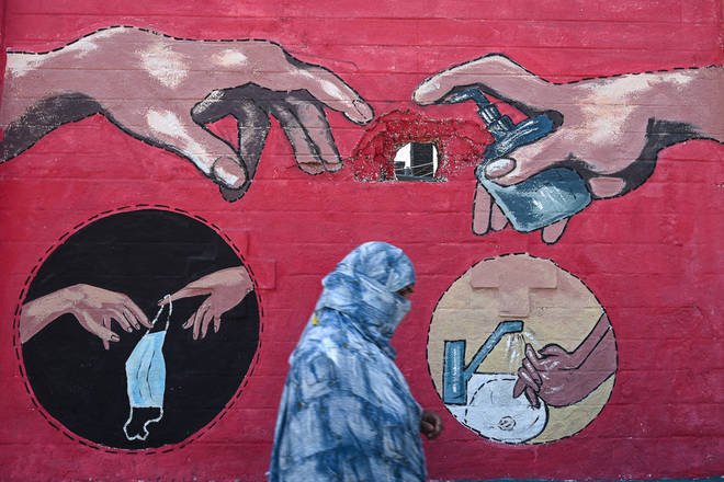 Indivíduo caminha em frente ao mural do afresco de Michelangelo "A Criação de Adão", retratando uma mão com uma garrafa de sabonete e outra carregando uma máscara, em Mumbai