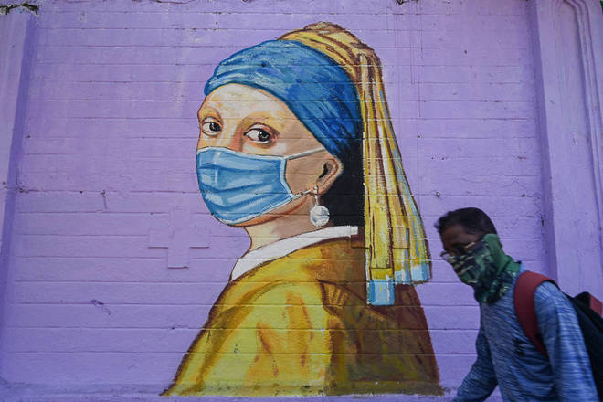 Um pedestre passa por um mural da "Moça com um brinco de pérola" de Johannes Vermeer usando uma máscara, em Mumbai