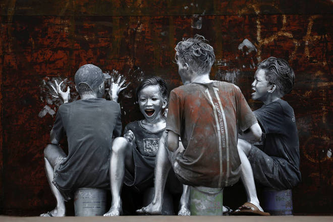 Os jovens, que se cobriram da cabeça aos pés com tinta para se tornarem" homens prateados", como parte de seu ato para ganhar a vida, riem enquanto andam na carroceria de um caminhão em Jacarta, Indonésia