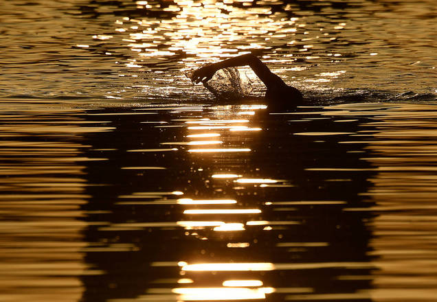 Um nadador treina no início da manhã no Lago Serpentine em Londres, na Inglaterra