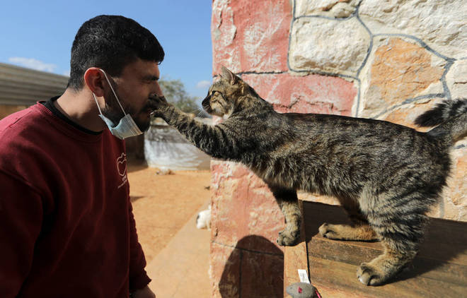 Um trabalhador brinca com um felino no santuário de Ernesto para gatos em Idlib, na Síria