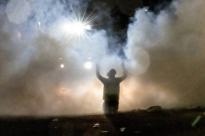 Polícia dispara gás lacrimogêneo, em frente à delegacia do Brooklyn Center, durante um protesto realizado após um policial atirar e matar um homem negro no subúrbio de Minneapolis, em Minnesota, nos Estados Unidos