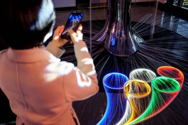 Um convidado tira fotos do logotipo dos cinco anéis olímpicos durante um evento de recepção à mídia organizado pelo comitê organizador dos Jogos Olímpicos de Inverno de Pequim em 2022, na China