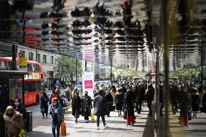Pessoas caminham na Oxford Street, em Londres, rua comercial mais movimentada da Europa, enquanto as restrições relacionadas ao coronavírus diminuem no Reino Unido
