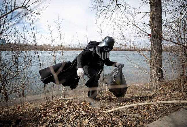 Um voluntário vestido de Darth Vader, personagem da saga Star Wars, recolhe o lixo durante um evento de limpeza de rua que marca o 60º aniversário do primeiro voo espacial tripulado na cidade de Irkutsk, na Rússia